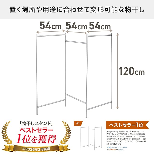 天馬(Tenma) 耐久性と美しさを兼ね備えた室内物干し インテリア物干し 差し込むだけの簡単組立 洗濯物干し 軽く持ち運べてコンパクトに収納できる物干しスタンド 【簡単組立】【色 オールステンレス】 【パネルS】 【幅54×奥行54×高さ120cm】 | Trend Design BASE店