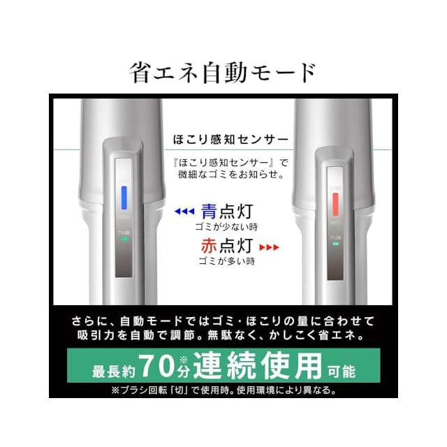 連続使用時間(満充電、バッテリー初期温度20℃):【標準】約35分【ターボ】約6分【自動】最長約70分(ブラシ回転「切」で使用時。使用環境により異なります。)