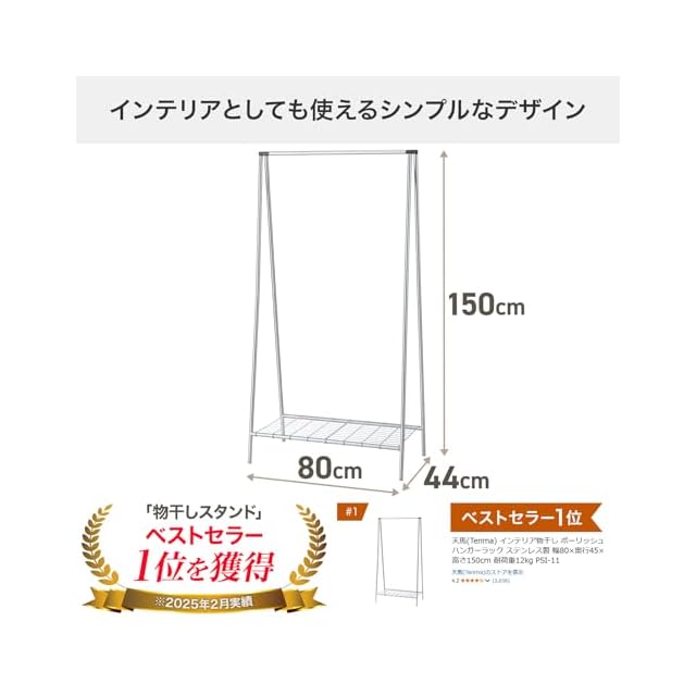 商品名:天馬(Tenma) インテリア物干し ポーリッシュ ハンガーラック ステンレス製 幅80×奥行45×高さ150cm 耐荷重12kg PSI-11