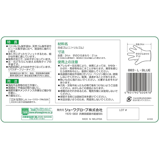 ショーワグローブ 【ニトリル手袋・食品衛生法適合】 No.883 ニトリスト・タフ 100枚入 ブルー Lサイズ 1函 ニトリルゴム 使い捨て 左右兼用 パウダーフリー ラテックスフリー
