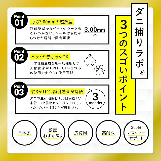 ✅従来にはなかった乾燥タイプのダニ捕りシートが新登場!20年以上の歴史がある衛生管理製品開発メーカー開発。独自開発のDNTECH-αと特許出願中のnano-DRY-Dを最大量配合させることで、ダニ捕りシートにダニを大量に誘きよせて一網打尽に。置くだけの乾燥タイプが、水分を多く持つダニに対してより効果的に働きます。化学性殺虫成分を一切利用していないので、子供やペットにも安心安全です。 ✅ダニの誘引試験では97.9%のダニの誘引に成功。ダニシートから放たれるDNTECH-αがダニを誘き寄せます。国内ダニトリシートトップレベルの誘引力です。匂いは設置しても気にならない匂いで、日々の生活もストレスフリーで過ごすことが可能です。 ✅独自成分のnano-DRY-Dが、ダニを二日で即乾燥。これまでのダニ捕りシートはダニを捕えてもダニが活動し続けることで排泄物や卵を産み、それらが外に出てしまったことも。しかし、乾燥タイプのダニ捕りラボは、80%以上が水分で含まれているダニを乾燥させることで2日で急速に弱体化させます。 ✅厚さわずか3.00mmの極薄設計。ポンっと置くだけでダニへの効果は3ヶ月持続。たった5秒もあれば、ベッドや押入れ、ソファなどあらゆる場所でダニ対策が可能です。
