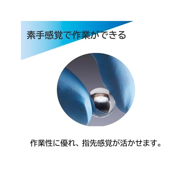 【均一な厚みで破れにくい】伸縮性のあるニトリルゴム製使い捨て手袋で、厚み約0.08mmのレギュラータイプ、手袋内面はパウダーフリー(粉なし)です。