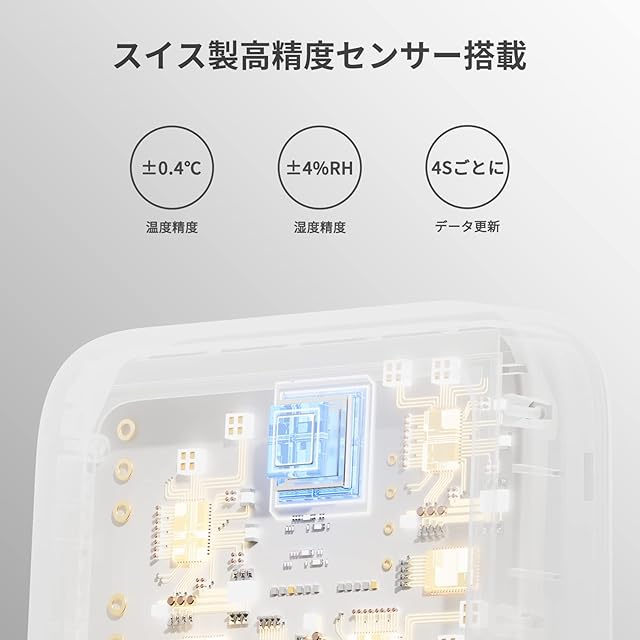 【スイス製高精度センサー搭載】0.1℃の温度差、1%RHの湿度差を感知できます。4秒ごとに温湿度を測定し、感度と精度の両方とも優れています。