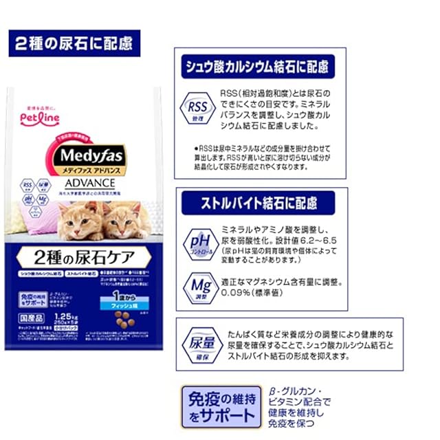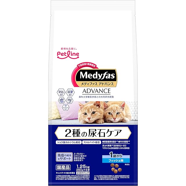 メディファスアドバンス キャットフード 2種の尿石ケア 1歳から フィッシュ味 【シュウ酸カルシウム/ストルバイト/国産/アルミ小分け」 1.25kg(250g×5)