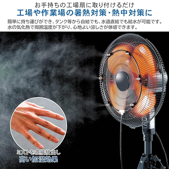 【快適ミスト】お手持ちの工場扇に取り付けるだけで快適なミストを噴霧するミストキットです。水の気化熱で周囲温度が下がり、心地よい涼しさが体感できます。熱中症対策や暑さ対策、また工場や作業場の粉塵対策・乾燥防止にオススメです。