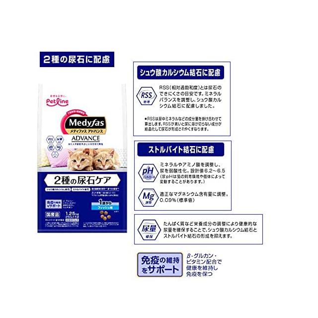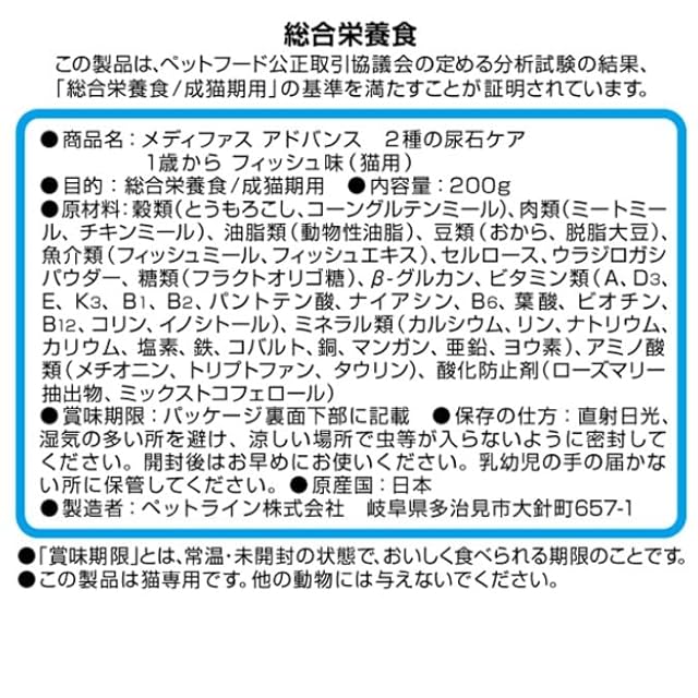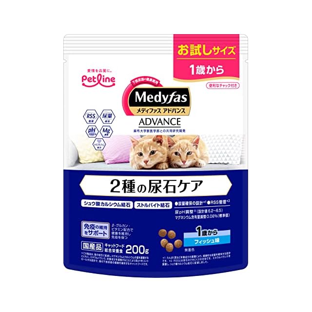商品名:メディファスアドバンス キャットフード 2種の尿石ケア 1歳から フィッシュ味 【シュウ酸カルシウム/ストルバイト/国産/お試し】 200g