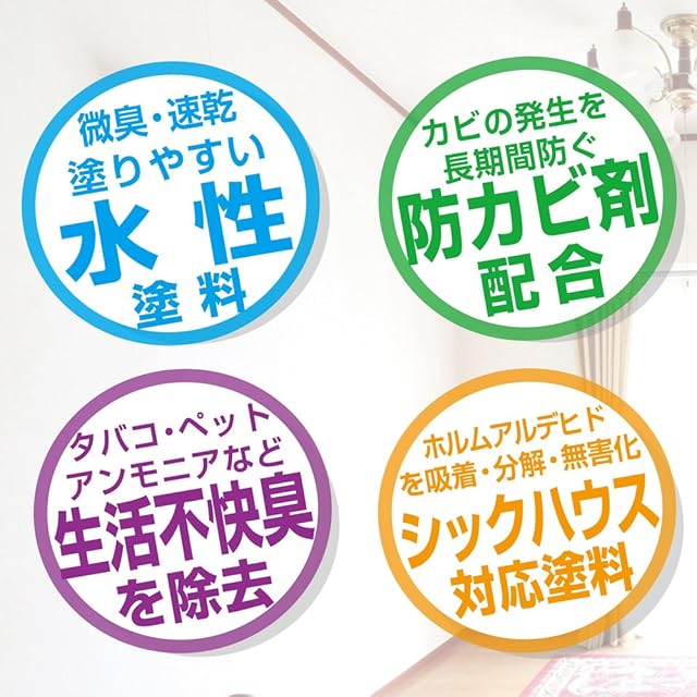 【特長】 ■[建築基準法対応塗料:F☆☆☆☆]低VOC(揮発性有機化合物)含有量0.5%以下。 (社)日本塗料工業会の目標水準1%を大きく下回った、安心・安全の環境にも配慮した製品です。 ■[生活臭を除去! ]タバコ / アンモニア / アミン / 硫化水素 / メルカプタンの5大不快臭及びペット臭や生活不快臭を除去します。※不快臭の除去能力の保持期間は、環境によって変動します。 ■[有害物質を無害化]シックハウス症候群の原因とされる有害物質(ホルムアルデヒド)を吸着し、無害化します。 ■[室内の壁を美しく]アクリル・シリコンが樹脂が強い塗膜を作り、室内の壁を美しく保ちます。 ■[カビの発生をガード]防かび剤配合で、カビの発生を防ぎます。 ■[水拭きが出来る]汚れが付き難く、中性洗剤を付けての水拭きが出来ます。 ■[使いやすいペンキ]ビニール壁紙にはシーラーなしで直接塗れます。 ■[落ち着いたツヤ感]卵の殻くらいの落ち着いた2分つやに仕上がります。