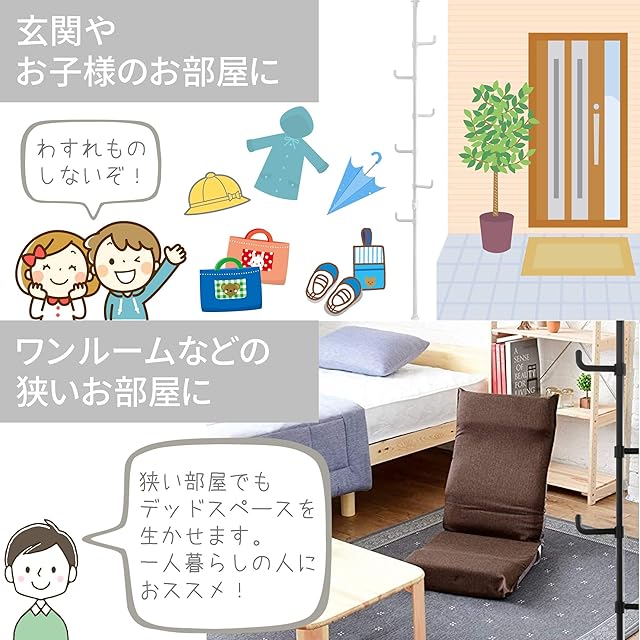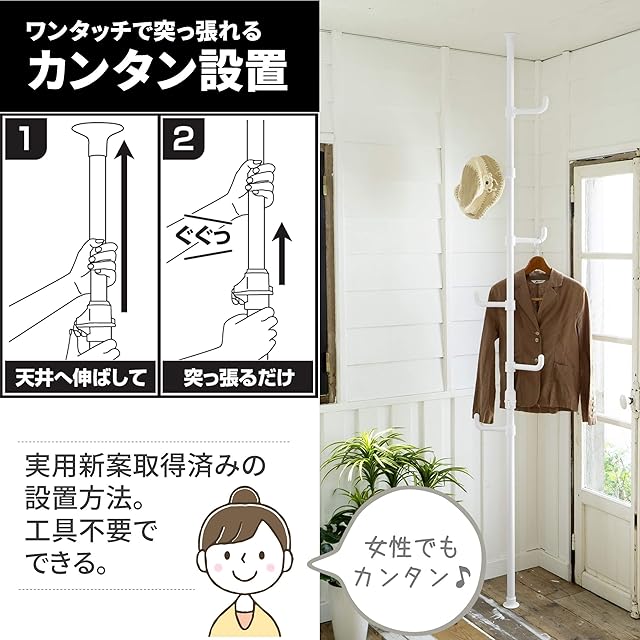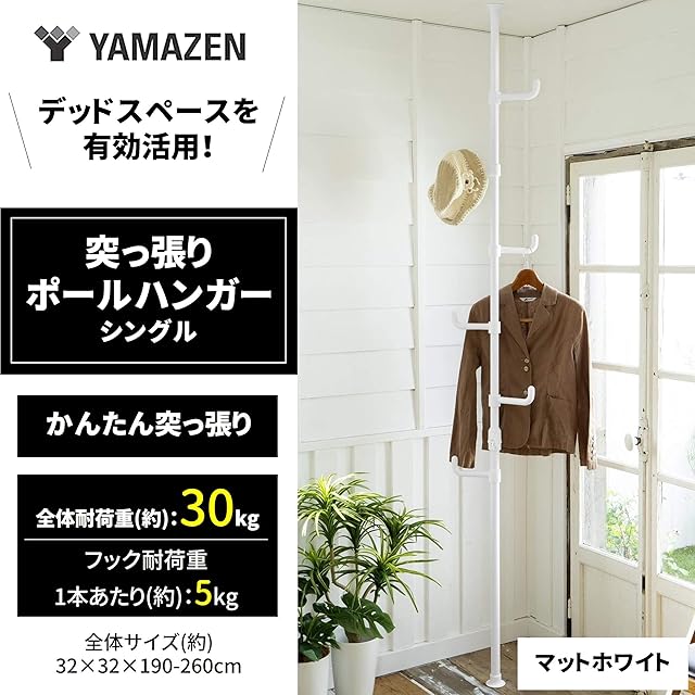 山善(YAMAZEN) 突っ張り ラック ポールハンガー 全体耐荷重30kg ワンタッチ突っ張り (実用新案取得済) 高さ190-260cm コートハンガー 玄関収納 一人暮らし 子供部屋 組立品 マットホワイト WJ-725RM(MWH) シングル | Trend Design BASE店