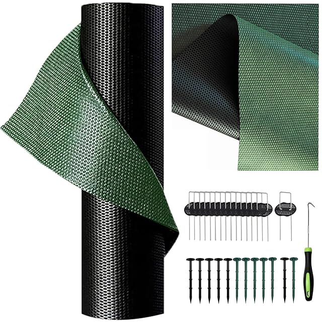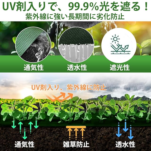 2【緑黒両面・丸穴設計】2025年最新改良版!先端の技術を採用し、グリンとブラック二つのカラーに設計されて、緑の面も黒い面もあり、どちらも使用できます。従来の単一カラーの防草シートより冷却効果は優れ、環境では美しくて用途が幅広くなります。★丸穴設計なので目詰まりしにくく浸透性と通気性に優れて、雑草の育成を防ぎながら水はけのよさも定評があります。液体肥料や水を透過させることができるため、大事な草花などを枯らす心配がありません。空気を良く通すことから土に影響を与えなく、土の栄養を維持し、農作物、花、樹木の成長を守ります。