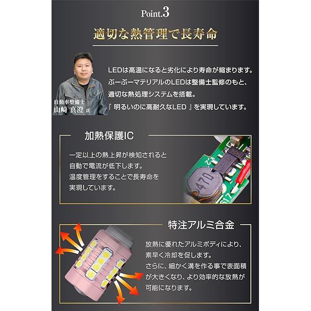 【明るくても超寿命】ぶーぶーマテリアルのLED製品はLEDドライバを搭載しています。ここでは電流値等をコントロールしており、長寿命を実現しています。またLEDのボディは放熱性抜群のアルミニウム素材を採用しており、さらにヒートシンク形状にすることにより効率的な熱処理を実現しました。おかげさまで多くのお客様よりご好評をいただいております。