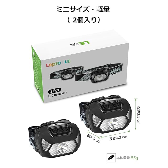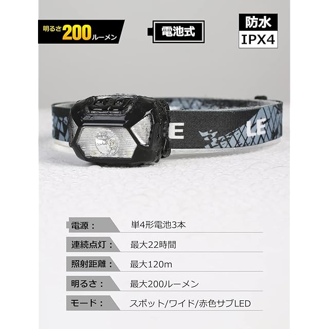 ヘッドライト LED ヘッドランプ 高輝度 ledヘッドライト 電池式 2個セット 【スポット・ワイド切替/ 明るさ200ルーメン/ 赤色サブLED搭載/ 実用点灯22時間/ CE ROHS認証済み/ 24ヶ月】 釣り 登山 キャンプ 散歩 作業 アウトドア 災害 停電用 小型 軽量 ヘッド ライト 明るさは200ルーメン、照射距離最大約150メートル。この明るさなら夜の散歩や暗い場所での活動に大活躍!地震、災害や突然停電した時にも役立ちます。ヘッドライトの先端は照射角度(45度まで)調整ができますので、足元だけではなく、照射周囲を広く照らし、危険がよく避けられます。スポットモードでHighは6時間、Lowは19時間点灯;ワイドモードでHighは7時間、Lowは22時間点灯;赤LEDモードで赤色点灯とSOS赤緑点滅は22時間点灯。赤色LEDライトで魚は警戒する事なく釣れます。雨・霧などの悪天候でも視認性が良く、遠くからでも確認しやすくなり、事故防止に役立ちます。単4形乾電池三本(別売り)で、実用点灯6~22時間。停電する時、電池を交換するだけですぐに再使用が可能になります。防滴仕様で、雨、地震、停電など万が一の時に防災用品としても十分にお使いいただけます。ヘッドライト本体の重さは約55gと非常に軽量です。また、ソフトベルトを採用され、夜釣りなどの場合は長時間装着しても首にストレスを与えません。登山、釣り、キャンプ、ハイキングや自動車整備などでのアウトドア活動に活躍します。CEとROHS認証済みです。また、2年間のメーカー付きますので、ご安心ください。