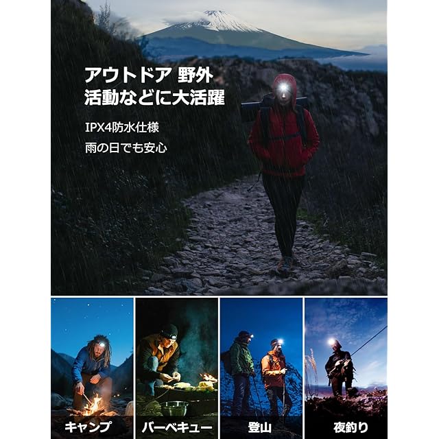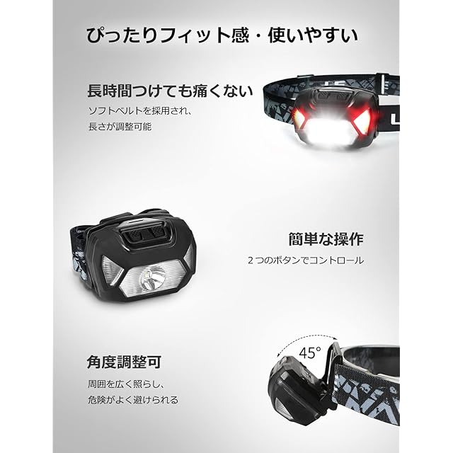 【軽量&フィット感】ヘッドライト本体の重さは約55gと非常に軽量です。また、ソフトベルトを採用しており、夜釣りなどで長時間装着しても首にストレスを与えません。登山、釣り、キャンプ、ハイキング、自動車整備などのアウトドア活動に最適です。