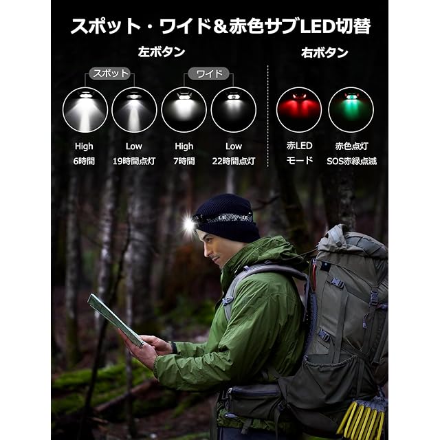 【スポット・ワイド・赤色サブLED切替】スポットモード:High/6時間点灯、Low/19時間点灯。ワイドモード:High/7時間点灯、Low/22時間点灯。赤色LEDモード:赤色点灯とSOS赤緑点滅/22時間点灯。赤色LEDライトは、魚が警戒することなく釣ることができます。雨・霧などの悪天候でも視認性が高く、遠くからでも確認しやすく、事故防止に役立ちます。