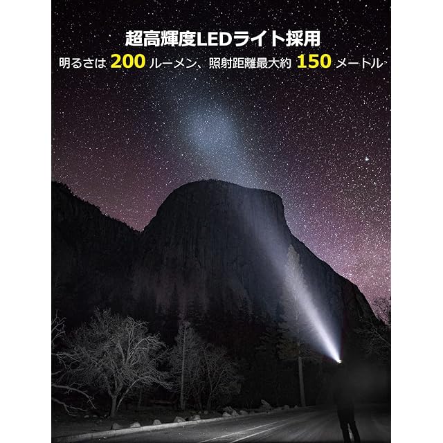 【高輝度LEDライト・照射角度調整可・防災停電対策】明るさは200ルーメン、最大照射距離約150メートル。夜間の散歩や暗い場所での活動に大活躍します!地震や災害、突然の停電時にも役立ちます。ヘッドライトの先端は45度まで角度調整が可能で、足元だけでなく周囲も広く照らし、危険を避けやすくなります。
