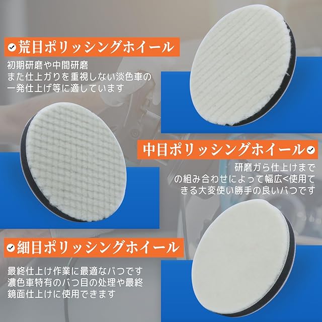 【5種類8個セット】荒目x2(表面のモノグラムのテクスチャー)、中目x2(十字型の表面テクスチャー)、細目x2(表面テクスチャーなし)3種類プロ用ポリッシングホイール + 2個細目ポリッシャースポンジバフ、使用頻度の高いアクセサリーの組み合わせ,完全達成可能お客様の表面研磨のニーズ