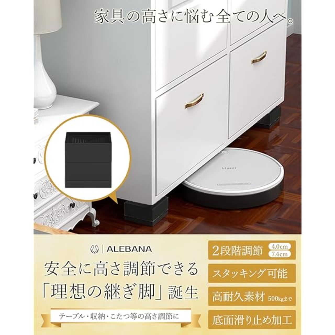 【高さ調整可能 】 スタッキングが可能なブロックタイプで、家具や用途に合わせて 調整 ができ、理想の高さを見つけられる 継ぎ足し です。本体には軽くて丈夫なポリプロピレン素材を採用。耐荷重は500kgと高耐久で、 テーブル や ソファー 、 ベッド など、あらゆる家具にお使いいただけます。 ※ 脚 がないタイプの家具には使用できません。 【高さを上げてもっと快適に】 机 の 高さ が合わず姿勢が悪くなったり、膝を曲げれない、 座椅子 に座りながらでは こたつ は使えないなど、お困りになった経験ありませんか? 机の高さ を調整することでリラックスして、くつろぐことができます。またベッドの高さを変えれば、収納スペースも確保でき、 ロボット掃除機 なども入る隙間もできる快適な生活を送ることができます。 【防滑設計】 床面にはTPUゴム素材を使用しました。 継ぎ脚 が滑らず、床に傷もつきにくく、防音効果も発揮します。家具面にも滑り止め加工を施し、抜群の安定感を実現しました。 ※家具を動かしたり、移動する際は、滑り止めが支点となり、落下やズレが生じる場合がございますので、ご注意ください。 【スタイリッシュなデザイン】 機能だけではなく、見た目にもこだわりました。正方形の 継ぎ足し は見た目にもオシャレで、インテリアにも馴染むデザインです。 【商品仕様】 ○サイズ:縦7.8cm、横7.8cm、 ○素材:本体/ポリプロピレン、底面滑り止め部分/TPUゴム ○ブランド:ALEBANA