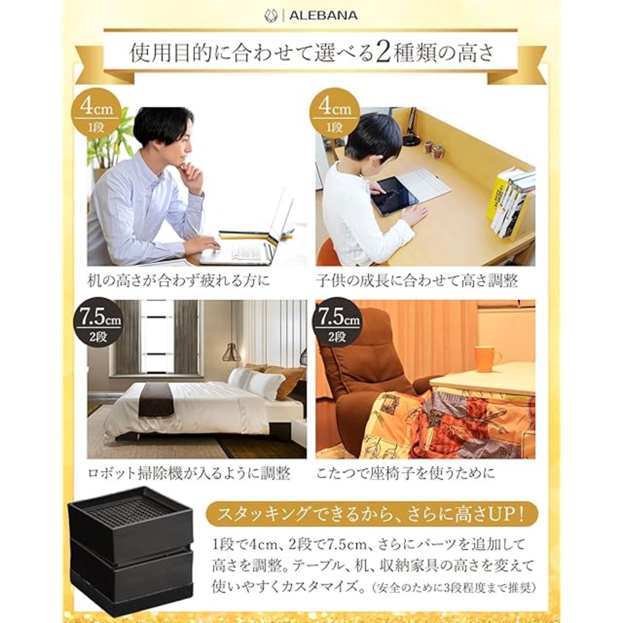 商品名:ALEBANA 高さ調整 机 こたつ 角足 継ぎ足し テーブル 高さ調節 ベッド 座椅子 ソファ の 脚 を 高く する 便利グッズ ポリプロピレン 正方形 (高さ7.5cm(2段), ブラック)