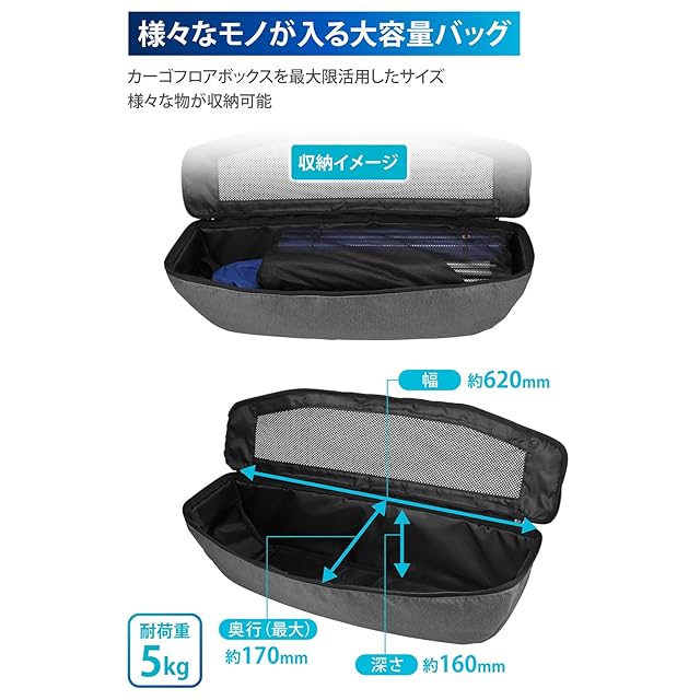 ✅様々なモノが入る大容量のバッグ✅ 内寸:深さ約160mm×幅約620mm×奥行(最大)約170mm。耐荷重5kg。 様々な物を入れておくことができます。 〇収納可能な物の例 ・遊び道具 ・レジャー用品 ・洗車用具 / 掃除用具 ・三角停止表示板 ※濡れた物、尖った物は入れないでください。また、濡れや汚れに弱いものは収納しないでください。