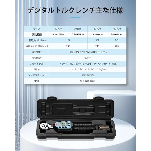 【3モード・4単位測定】トラック(T)/ピークホールド(P) /プレセット(Pre)、【測定単位】 N・m /ft・lbf/ in・lbf /kgf・cm。測定範囲や広く万能で使いやすい、自動車タイヤ交換や自転車などの整備におい用途に合わせて必要なデジタルトルクレンチ。