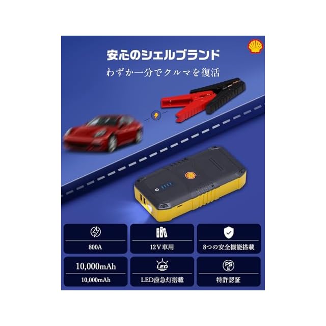 商品名:Shell シェル ジャンプスターター 10000mAh大容量 ピーク電流800A 12V車用 エンジンスターター 安全保護機能搭載 車緊急始動 モバイルバッテリー LED緊急ライト搭載 PSE認証済 日本語取扱説明書 SSL-SJP011