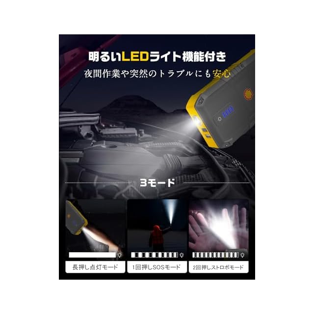 【携帯便利·緊急ライト】Shell ジャンプスターターは必要な時にすぐ手に入れて使用できるよう、本製品は「コンパクトで便利」「持ち運びやすくて収納便利」という理念を中心に設計されています。優れた防水・防塵性設計、頑丈で強化されたケースは、あらゆる環境に耐えることができます。そのほか、3種類のモードを搭載しているLEDライトは、簡単にSOSモード、ストロボモード、点灯モードに切り替えられ、暗い環境の下でも楽々作業できます。