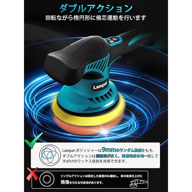 商品名:Lampat ポリッシャー 車 ダブルアクション コードレス 電動ポリッシャー 充電式 8段階変速 150mm裏板 6000-2500RPM 強力モーター 過熱防止機能 バッテリー残量表示 偏心構造 ワックス掛け 艶出し 車磨き 鏡面磨き 錆落し ランダムオービットサンダ 家庭用 研磨機 ポリッシャー マキタ 18Vバッテリー対応可能 【本体のみ・バッテリーと充電器別売】 日本語取扱説明書