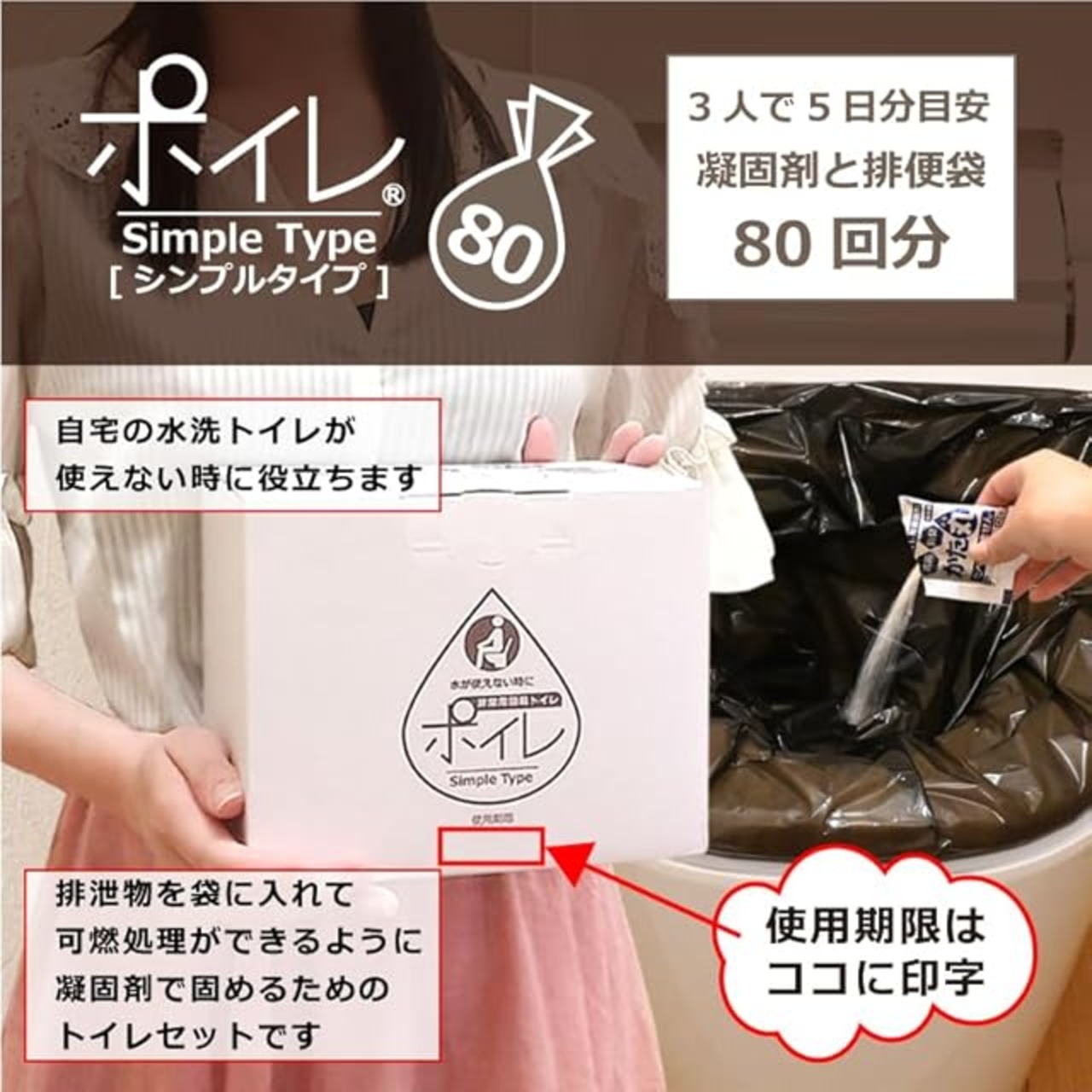 商品名:ポイレ 簡易トイレ 携帯トイレ 80回分 防災士 監修 日本製 15年保存 シンプルタイプ 抗菌 消臭 凝固剤 排便袋 災害対策