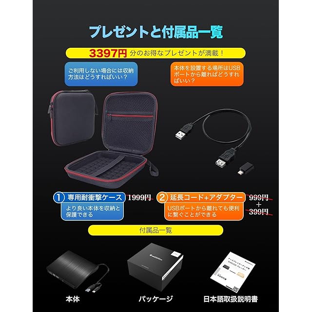 ●お得なプレゼントも満載:①DVD・CDドライブケース。安全・耐久性の良い素材を採用して、DVD・CDドライブをしっかり保護できます。内側に粘着的なストラップ付きで、ケーブル及びDVD・CDをよく固定できて落下の心配はありません。②延長コード。このUSB延長コードを使用すれば、USBポートから離れて接続することが便利に繋ぐことができます