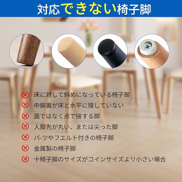 サイズ選び不要・木製脚にどんな形状でも取り付け可能:この椅子脚カバーは、コインサイズ以上の木製椅子脚であれば、形状に関係なく取り付け可能です。四角型、丸型、長方形などはもちろん、前後の足の形状が違うデザインの椅子にも対応可能です。めんどうな採寸作業は不要です。※ご注意:木製脚専用です(金属・斜め脚・点接点脚は非対応)。安全な取り外しのため、説明書の手順をご確認ください。