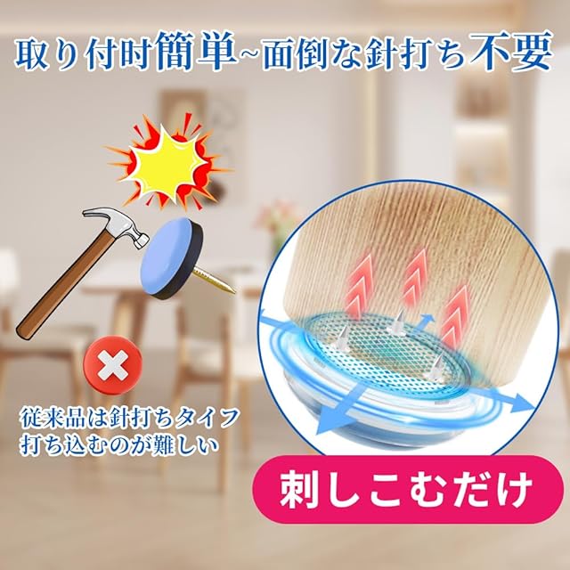 取付かんたん:ハンマーを使って打ち込む釘状のスライダーはまっすぐ打つのが難しく、慣れないと手を打ったりして危険です。COOLHILLの椅子脚カバーの取り付けは非常に簡単で、女性でも簡単に取り付けることができます。