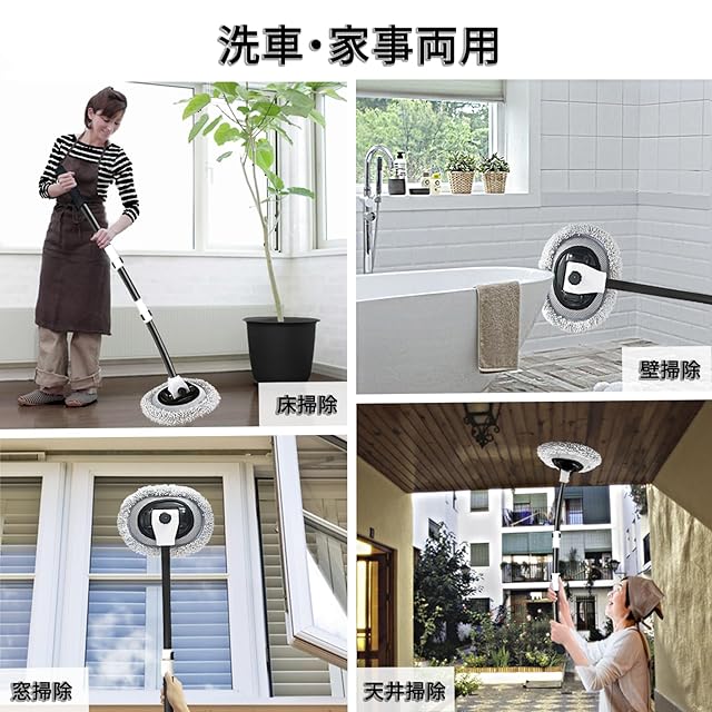 洗車家事両用:弊社の洗車用具は洗車用だけでなく、家事にも役に立ちます。曲がった柄と長さ調節可能なデザインにより、家庭の狭い隅々まで簡単に掃除できます。天井、エアコン、窓などの高所の掃除は勿論、床、浴室、壁、船、プールなどの掃除にも適する万能な道具です。