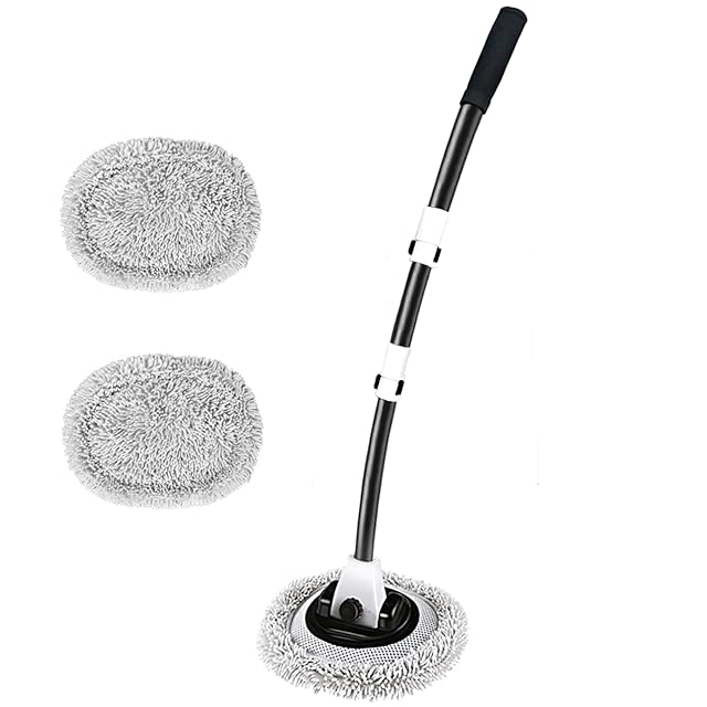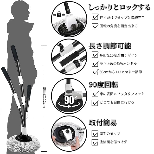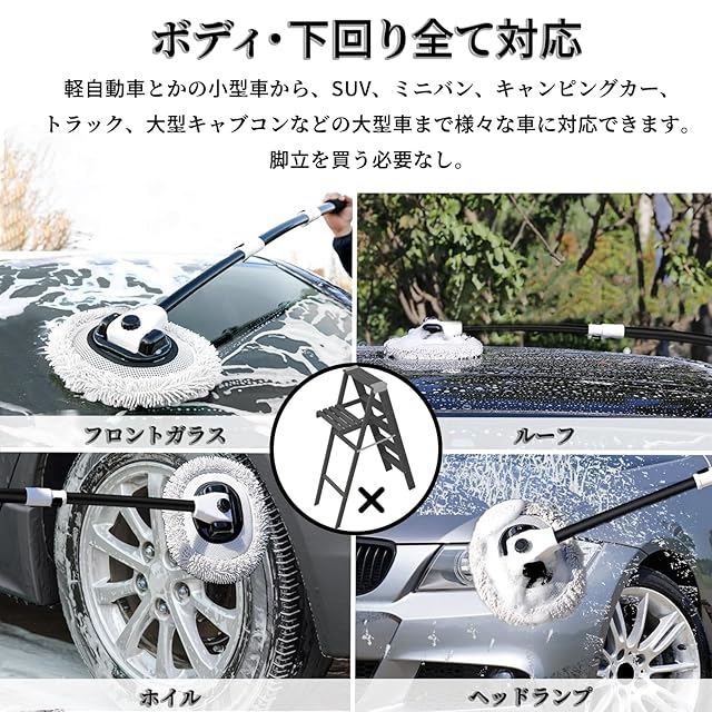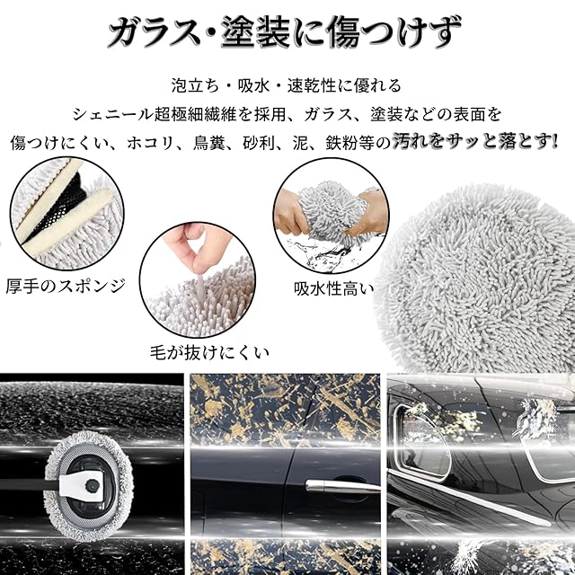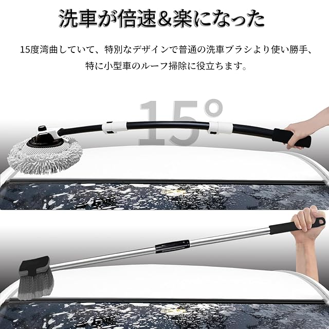 3階段伸縮アルミポール&傷つけずに洗浄可能:高品質のアルミニウム合金を厳選して、洗車スポンジのロッドを堅牢で錆びにくいものに仕上げました。長持ちするため、交換の必要がなく、不要なコストを節約できます。洗車モップのハンドル部分には快適なEVA素材を使用しており、人間工学に基づいた設計で握りやすく、滑りにくいので洗う時の力加減が調整しやすく、省力で効率的な作業が行われます。初めて手洗い洗車をしてみような方にもぴったり!モップヘッドは高密度のシェニール超極細繊維を採用しております、柔らかくて吸水性が高く、超極細繊維が小さな汚れまでキャッチし、広い範囲も効率的に洗車可能。大型SUVのルーフまで洗えるだけでなく、小型車のホイール等細部の掃除も簡単に行えます。ご愛車の塗装面を傷つけずに、ホコリ、泥、鳥糞、油分などの汚れをしっかり吸着し取り去けます、水汚れや糸くずも残しません、サササッと洗えてピカピカになれます。洗車の初心者でもプロでも、この15度曲がった洗車ブラシで従来の製品と異なる洗車体験をもらえます。