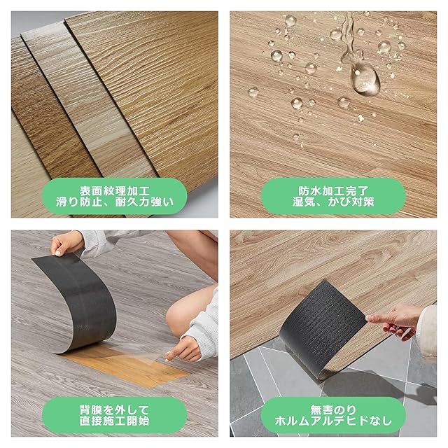 【防水・滑り止め】フロアタイル表面には耐久性に優れた特殊クリア加工・抗菌加工に加え、防水、表面についた汚れは濡れ雑巾などでふき取ってください。滑りにくいです。キッチン、トイレ、子供部屋、リビング、ダイニング、玄関、店舗、脱衣所、洗面台、カフェ、オフィスなどでお使いおすすめます。