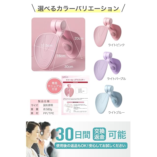 my favory'sのスマートレッグスライダーは、内転筋・骨盤底筋群を手軽にトレーニングできる器具です。ヨガインストラクター監修のもと「1.組立てやすさ」「2.肌にやさしい素材・形状」「3.適度な負荷量」にこだわり開発しました。負荷の強さは、モニターの方にご協力いただき、運動不足の女性にちょうどよい強さに調整しました。そのため、「最近運動不足を感じている……」という女性にはピッタリの商品です。一方、ふだんから高負荷の運動をしている女性や、成人男性にとっては負荷が軽く感じる可能性があります。あらかじめご了承いただけましたら幸いです。