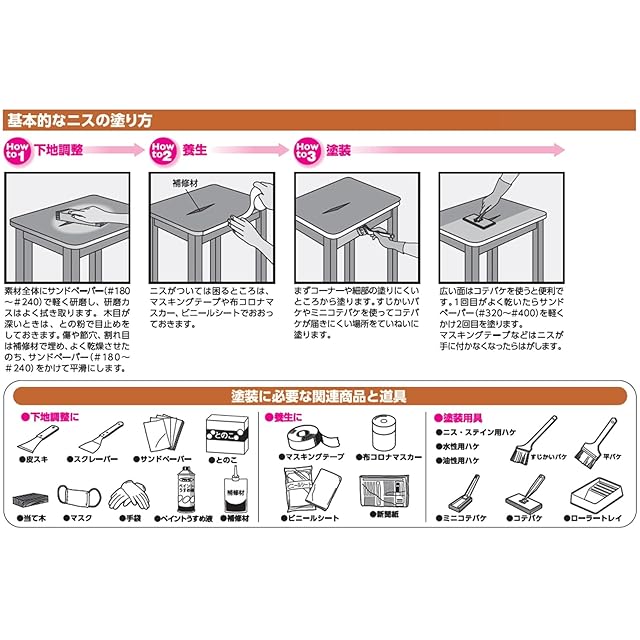 用途: (屋内外区分:屋内用)手作り家具・建具・木製品・工作品などの屋内木部(高級家具を除く)、無垢木材床(フローリングを除く)