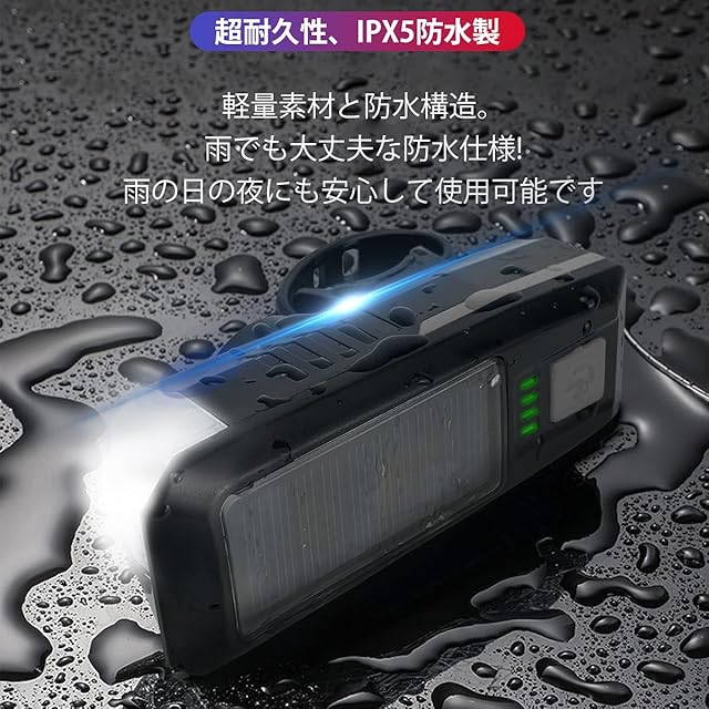 【USB急速充電&ソーラー補助搭載・防災認証】充電方法にはソーラー充電とUSB充電二種類があります。省エネルギーだけではなく、災害時にも非常用ライトとしても大活躍、経済産業省「防災推奨製品」。ソーラー充電:ソーラーパネルを搭載しているため、光の当たるところに置けば自動で充電できます。サイクリングの際には電量補給可能。USB充電:付属USBケーブルでの充電も可能です。1日中使ってもバッテリー切れの心配がありません。4段階LEDインジケーター(残量25%毎表示)四つのインジケータライトにより電池残量が分かり充電のタイミングも把握でき、急にライトが消灯することもありません。過放電防止回路内蔵(電圧3.2V以下で自動遮断)