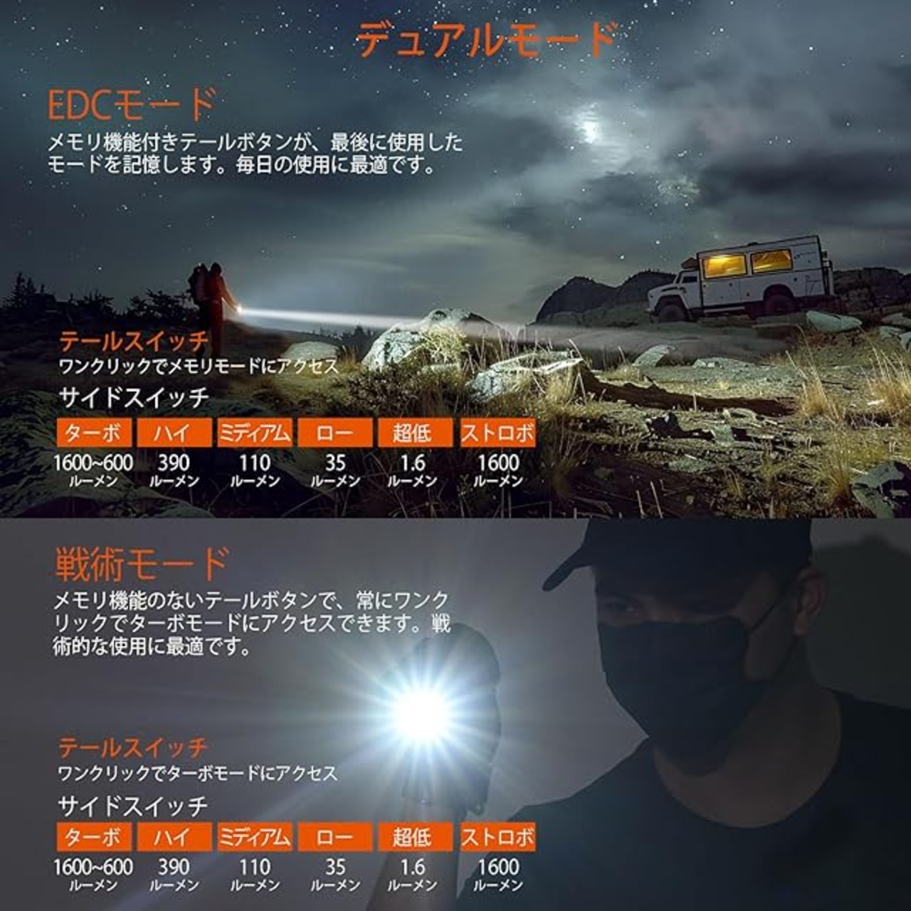 デュアルモード切り替え、多様なニーズに対応:EDCモードとタクティカルモードを自由に切り替え可能。EDCモードでは、記憶した設定をワンタッチで起動し、日常のシーンを迅速に照らします。タクティカルモードでは、最大の明るさを瞬時にオンにでき、重要な瞬間にすばやく対応します。