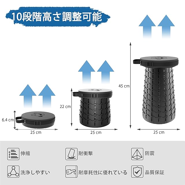 『伸縮式で高度自由調節ができて持ち運びも簡単!』 簡単で素早く開閉でき、高度自由調節アウトドアチェアです。展開する前にはまるいバックの形で、全然スツールの様子に見えないです。展開する後は高度45cmの椅子になり、更に好きな高度を選択して回転して調節できます。大人から子供までお使いいただけます。持ち運び楽々の軽量設計、コンパクトに畳める伸縮スツールで、面白くて、携帯も収納も便利です!