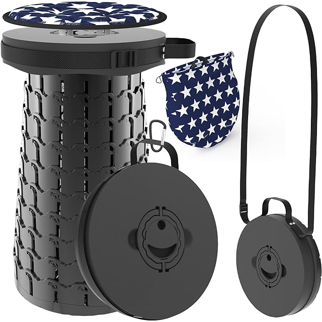 『高さ調節も自由自在折り畳みスツール』 セット内容:折りたたみスツール本体x1、星柄収納バッグx1、360度回転クッション、カラビナx1 最新第5世代折りたたみ椅子、より軽量化、より頑丈、より高い耐久性!
