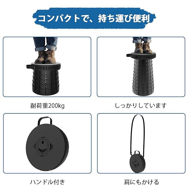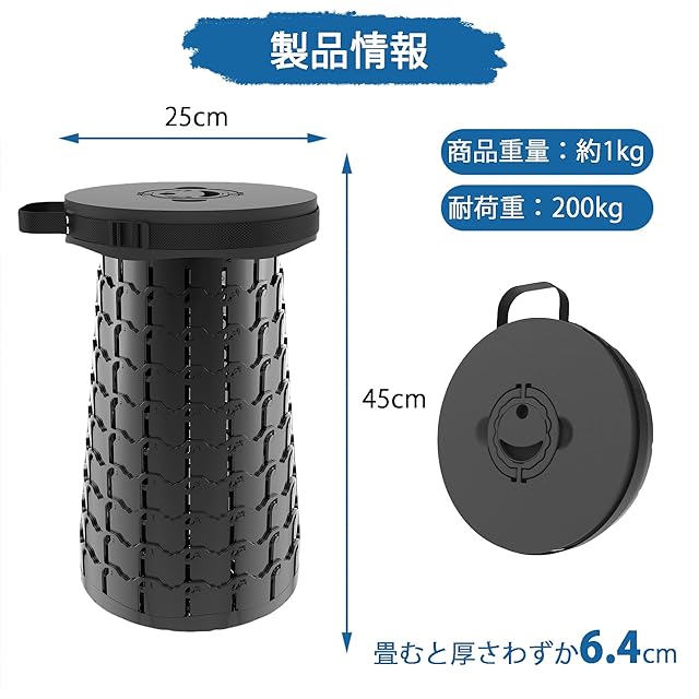 <p><b>【快適性のアップグレード】</b></p> <p>折りたたみ椅子は、人間工学に基づいて設計された円形の表面を採用して、椅子の最大の座部奥行きは25cmになります。</p> <p>座席面積を大幅に拡大し、体重を分散させることができます。そして、360度回転クッションも付いているので、長時間座ってもが平気です。</p> <p><b>【楽々折畳と各場合に適用】</b></p> <p>この折りたたみ椅子は高さ6.4cmから45cmまで調整でき、さまざまな体型の人のニーズを満たすことができます。</p> <p>椅子1つで家族全員とも使用できます。自宅にお客様が来る際にもご利用いただけます。</p> <p>妊娠中の女性、年寄り、足痛みのある人、アウトドアアクティビティ愛好家などへの最高のプレゼントです。室内と屋外の両方の場合で適用できます。</p> <p>室内:シャワーするとき・玄関で靴交換スツールとして・子供の椅子としてなど。 アウトドア:キャンプ・釣り・ハイキング・花見・バーベキュー・スポーツ観戦・山登りなど</p>