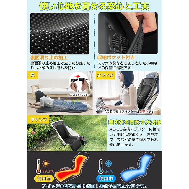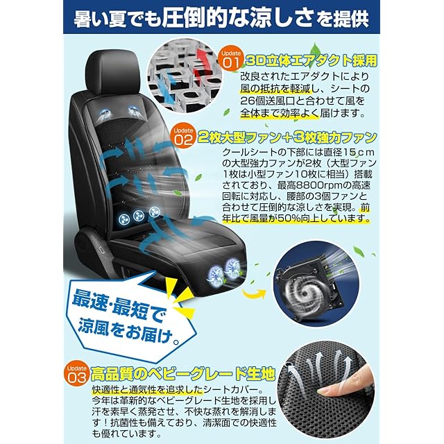 【業界トップクラスの大風量&快適な座り心地&優れた通気性】風量が弱い、座り心地が微妙、背中まで風が来ない...などお客様の声を受けて、改良された新商品が登場しました!①エアダクトの構造を改良!今年のクールシートは、無駄なく空気が流れる立方体ガイド層を備えたエアダクトを採用。本体の下部にあるファンから取り入れた空気を効率よくシート表面まで届けます。さらに首元に2つ吹き出し口を追加したことにより、暑くなりがちな首元まで涼しい風を送る事ができます。②立体構造(3D構造)のメッシュ生地を採用!従来のメッシュ生地よりも1~2mmほど厚さが増したことにより、クッション性が向上し長時間座っても疲れにくく快適な座り心地となりました。通気性に優れた3D立体構造のメッシュ生地のため、スイッチを入れていなくても、通常のシートより涼しく感じていただけます。また、高品質のベビーグレードの環境に優しい素材で作られており、汗や水分を素早く蒸発させ、快適さを持続!抗菌防臭加工など衛生面にも配慮した素材です。