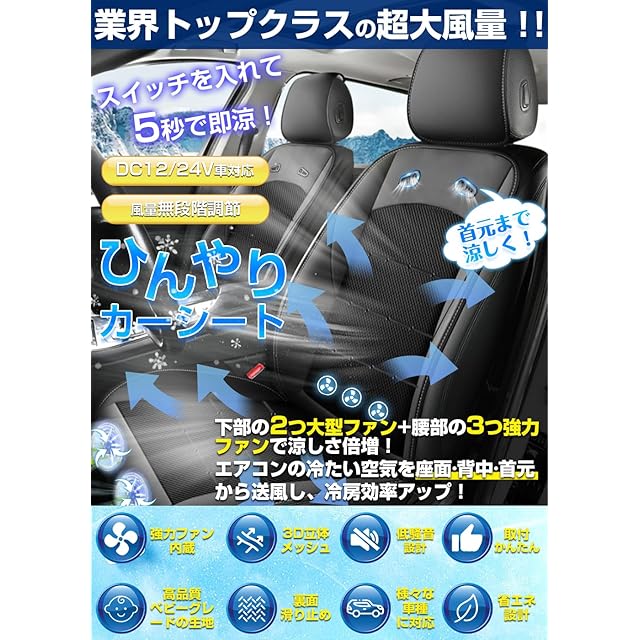 商品名:クールシート 車 【2025進化超大風量 無段階調整 DC12V/24V対応】 クールカーシート カーシート 2枚超大型ファン+3枚強力ファン パワフル送風 首元/背中/座面 低騒音 ムレ防止 夏 快適ドライブ 通気性 滑り止め 取り付け簡単 普通車 軽自動車 トラック 猛暑対策 日本語取扱説明書付