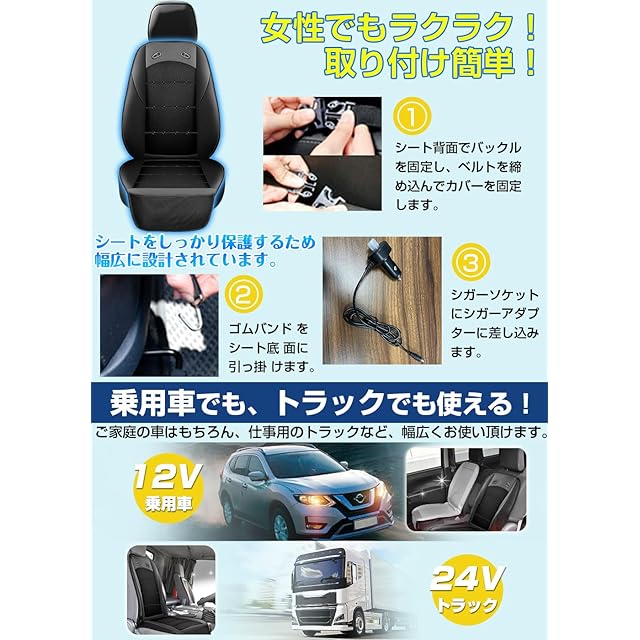 【取付簡単&安心】クールシートのゴムバンドをお車に掛けてシガーライターソケットに差し込むだけの簡単接続! 誰でも簡単に取り付け可能で、届いたその日からご使用いただけます。初期不良や使用中の自然故障等の場合は商品交換などのサービスを提供致いたします。万が一、商品について何か不明なところがあれば、是非遠慮なく気軽にお問い合わせください。