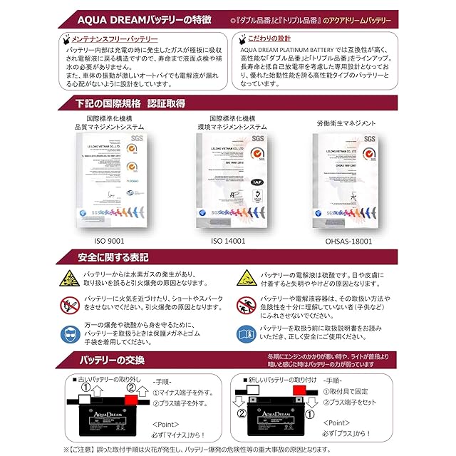 商品名:アクアドリーム バイク用 バッテリー 液入充電済 MF ADTX5L-BS/ADTZ6V/ADTZ7S (12V/6Ah/互換/YTX5L-BS/YTZ6V/YTZ7S)
