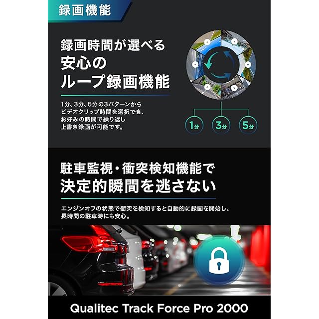 【録画機能|ループ録画機能を搭載したQualitecのミラー型ドライブレコーダー】本製品はループ録画機能を搭載しており、microSDカードの容量がいっぱいになっても古い映像から自動で上書き保存されるため、常に最新の映像を逃すことなく記録し続けることができます。録画の手間を意識する必要がなく、長距離のドライブや業務用途でも安心して使用可能です。また、駐車中のトラブルにも対応できる「駐車監視モード」を搭載。Gセンサーが衝撃を検知すると、前後の映像を自動で録画保存。エンジンを切った状態でも車両のを監視し、不在時の当て逃げやいたずらなどを記録します。走行中も停車中も頼りになる、高性能なミラー型ドライブレコーダーです。