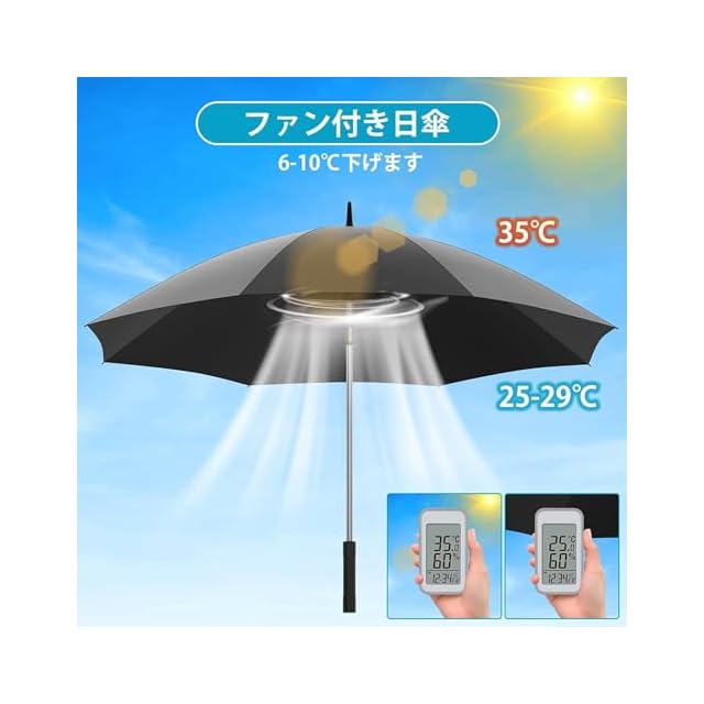 【ワンボタン・操作簡単】ワンボタンで操作できる便利な設計です。手元のボタンを一回に押すとファンから送風し、2回に押したらより強い風が送られます。また、傘を閉じるとファンが自動的にオフします。
