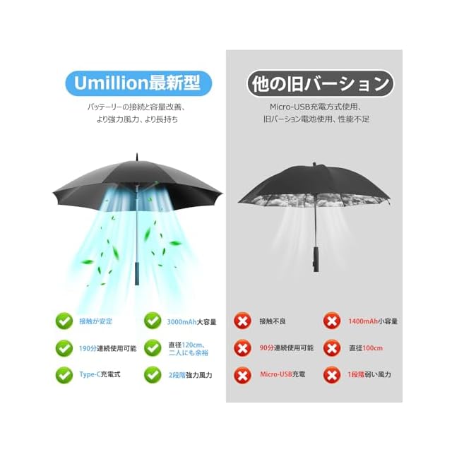 Umillion 日傘 扇風機付き日傘 ファン付き 長傘 120CM usb充電式 2段階送風 8本骨 UVカット 晴雨兼用傘 撥水加工 暑さ対策 遮光 遮熱 遮蔽率99% 男女兼用 通勤 通学 スポーツ観戦 サッカー ゴルフ 黒