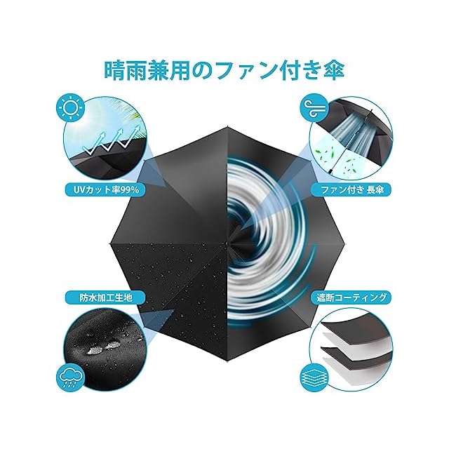 商品名:Umillion 日傘 扇風機付き日傘 ファン付き 長傘 120CM usb充電式 2段階送風 8本骨 UVカット 晴雨兼用傘 撥水加工 暑さ対策 遮光 遮熱 遮蔽率99% 男女兼用 通勤 通学 スポーツ観戦 サッカー ゴルフ 黒