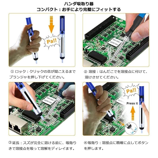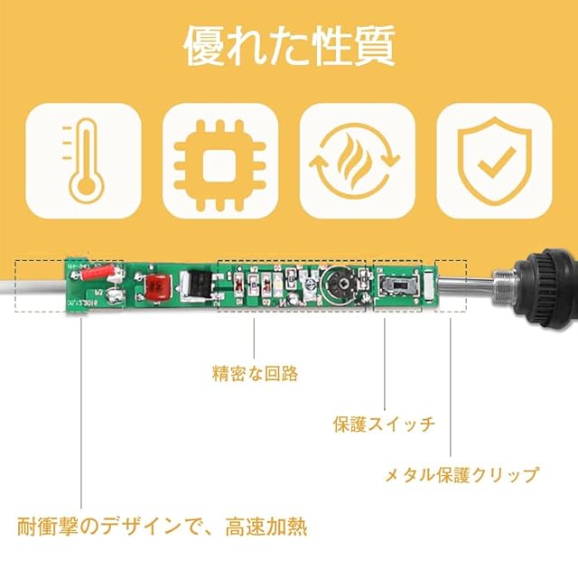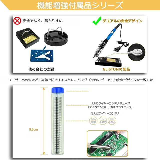 豊かな付属品があり、電気修理、家庭DIYおよびその他のはんだ付け作業に最適です。 ・スイッチのインジケータライトがあり、滑り止めと抗高温保護機能が揃え、より安全が高いです。 ・温度調整機能付、200℃~450℃に調整できる。 ・効率的な放熱設計(先端に4つの放熱穴)を備えているため、放熱効果が高く、寿命が長くなります。 ・静電防止ピンセットを付けているため、回路基板のはんだは簡単でフレキシブルです。 ・硬質のプラスチック製のケースで、はんだこてや付属品を収納し、持ち運びや保管にも便利です。