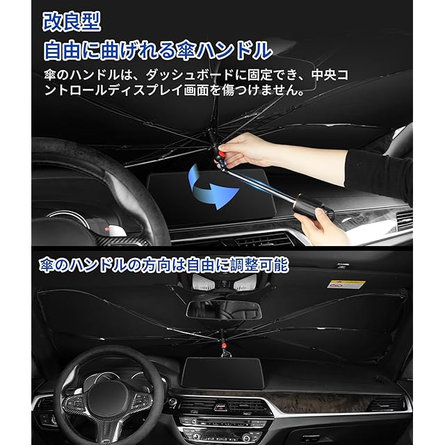 【改良した傘柄・ご愛車を守る】この車用日除け折り畳み傘のハンドルは改良され、曲げられるデザインを採用しております。傘のハンドルの方向を自由に調整でき、ダッシュバネルに固定し、中央制御ディスプレイを損傷することはありません。さらに、この車用サンシェード傘の先端には、傘の露先を覆う保護カバーも付いており、フロントガラスを傷つけなく、ご愛車により包括的なケアをもたらします。